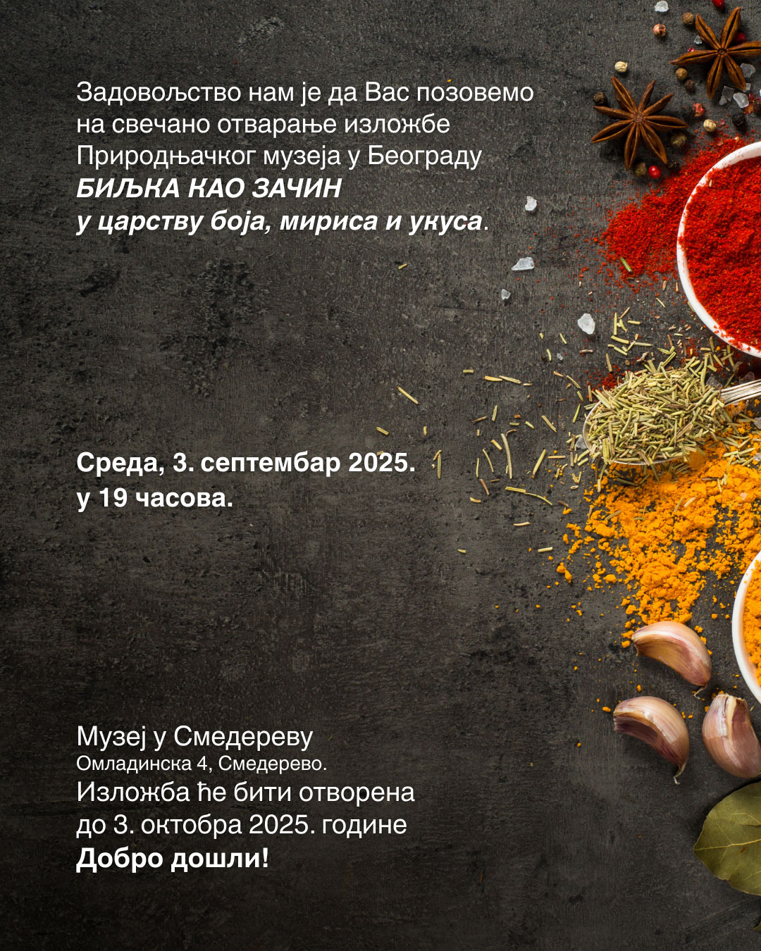 Наставак вишегодишње успешне сарадње Природњачког Музеја из Београда и нашег музеја доводи нам у Смедерево изложбу „Биљка као зачин. У царству боја, мириса и укуса“.