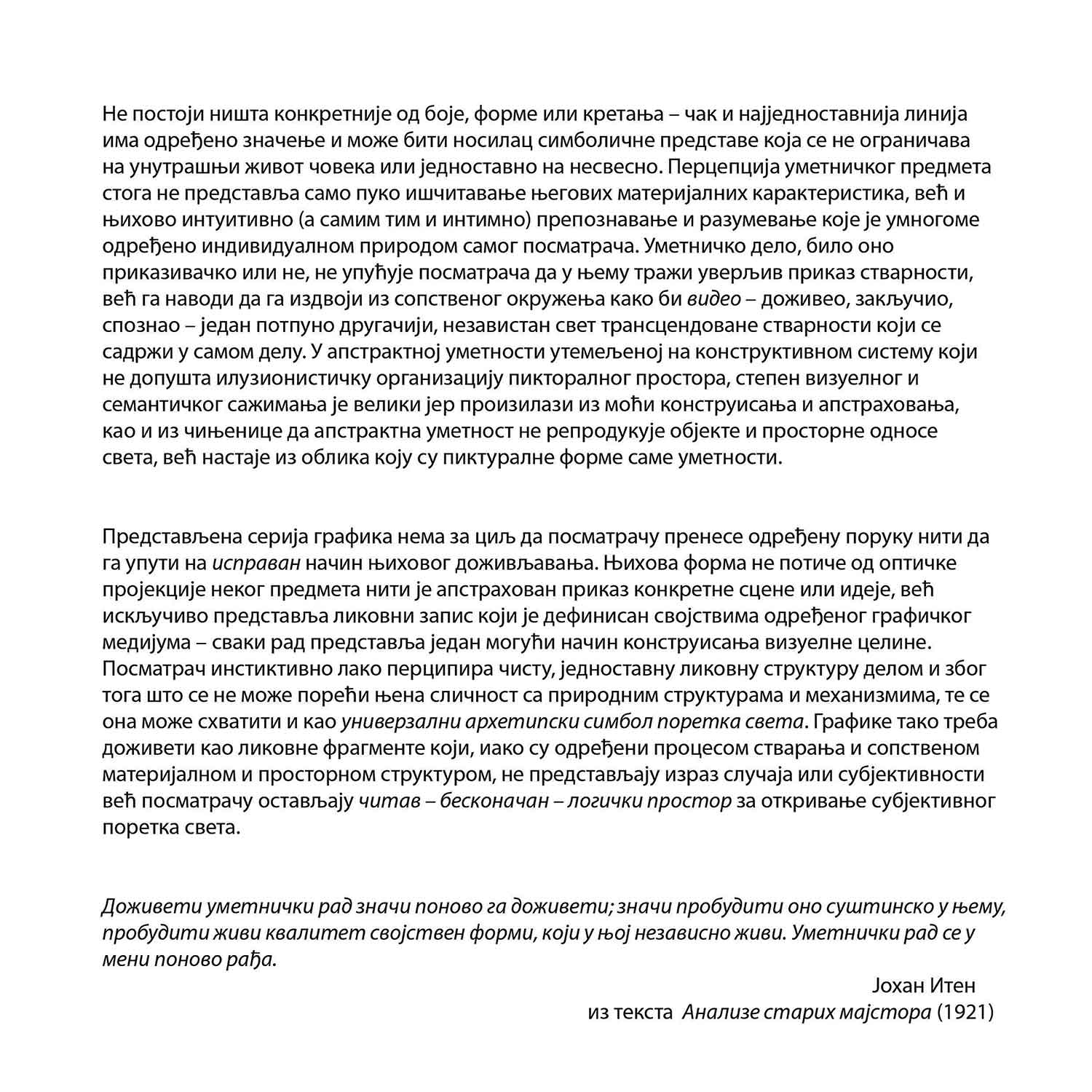 Представљена серија графика нема за циљ да посматрачу пренесе одређену поруку нити да га упути на исправан начин њиховог доживљавања. Њихова форма не потиче од оптичке пројекције неког предмета нити је апстрахован приказ конкретне сцене или идеје, већ искључиво представља ликовни запис који је дефинисан својствима одређеног графичког медијума – сваки рад представља један могући начин конструисања визуелне целине. Посматрач инстиктивно лако перципира чисту, једноставну ликовну структуру делом и због тога што се не може порећи њена сличност са природним структурама и механизмима, те се она може схватити и као универзални архетипски симбол поретка света. Графике тако треба доживети као ликовне фрагменте који, иако су одређени процесом стварања и сопственом материјалном и просторном структуром, не представљају израз случаја или субјективности већ посматрачу остављају читав – бесконачан – логички пpocтop за откривање субјективног поретка света.