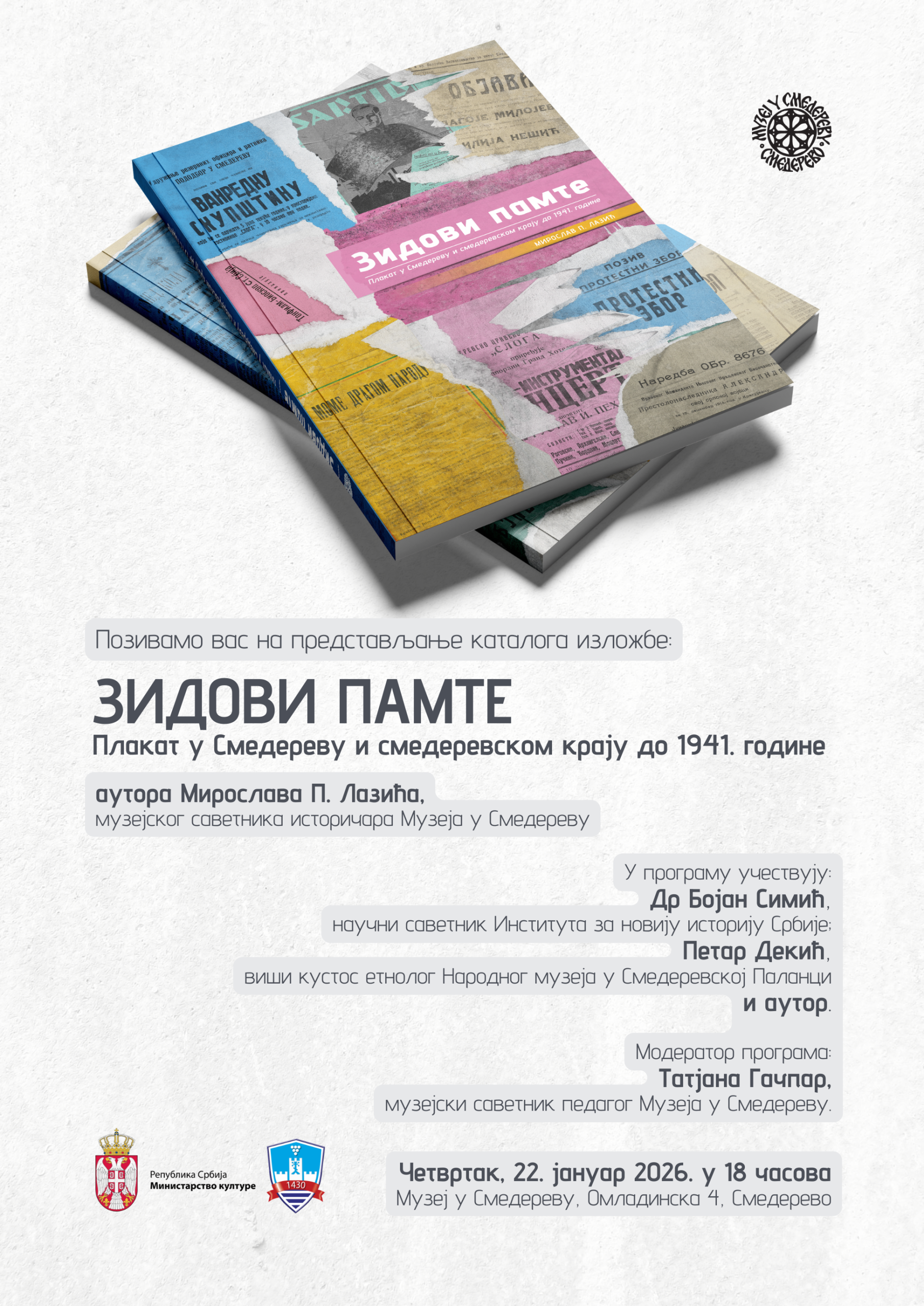 Музеј у Смедереву има част да најави промоцију каталога изложбе „Зидови памте – Плакат у Смедереву и смедеревском крају до 1941. године“, ауторa Мирославa П. Лазићa, музејског саветника историчара Музеја у Смедереву, која ће бити одржана у четвртак, 22. јануара 2026. године, са почетком у 18 часова, у првој сали Музеја у Смедереву.