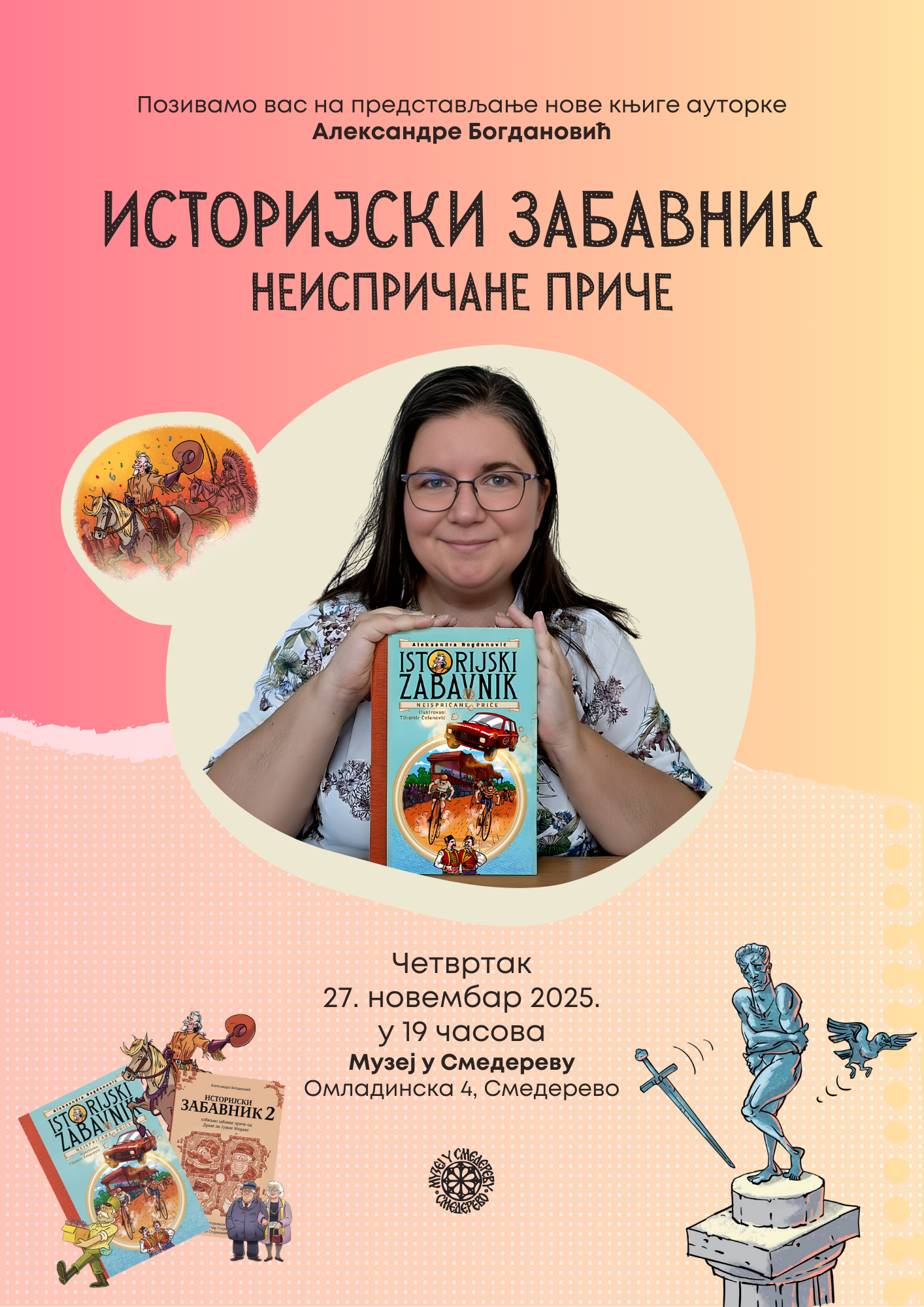 Позивамо вас на промоцију књиге „Историјски забавник – неиспричане приче“, ауторке Александре Богдановић, новинарке и оснивачице сајта Историјски забавник. Промоција ће се одржати у четвртак, 27. новембра у 19 часова у Музеју у Смедереву.