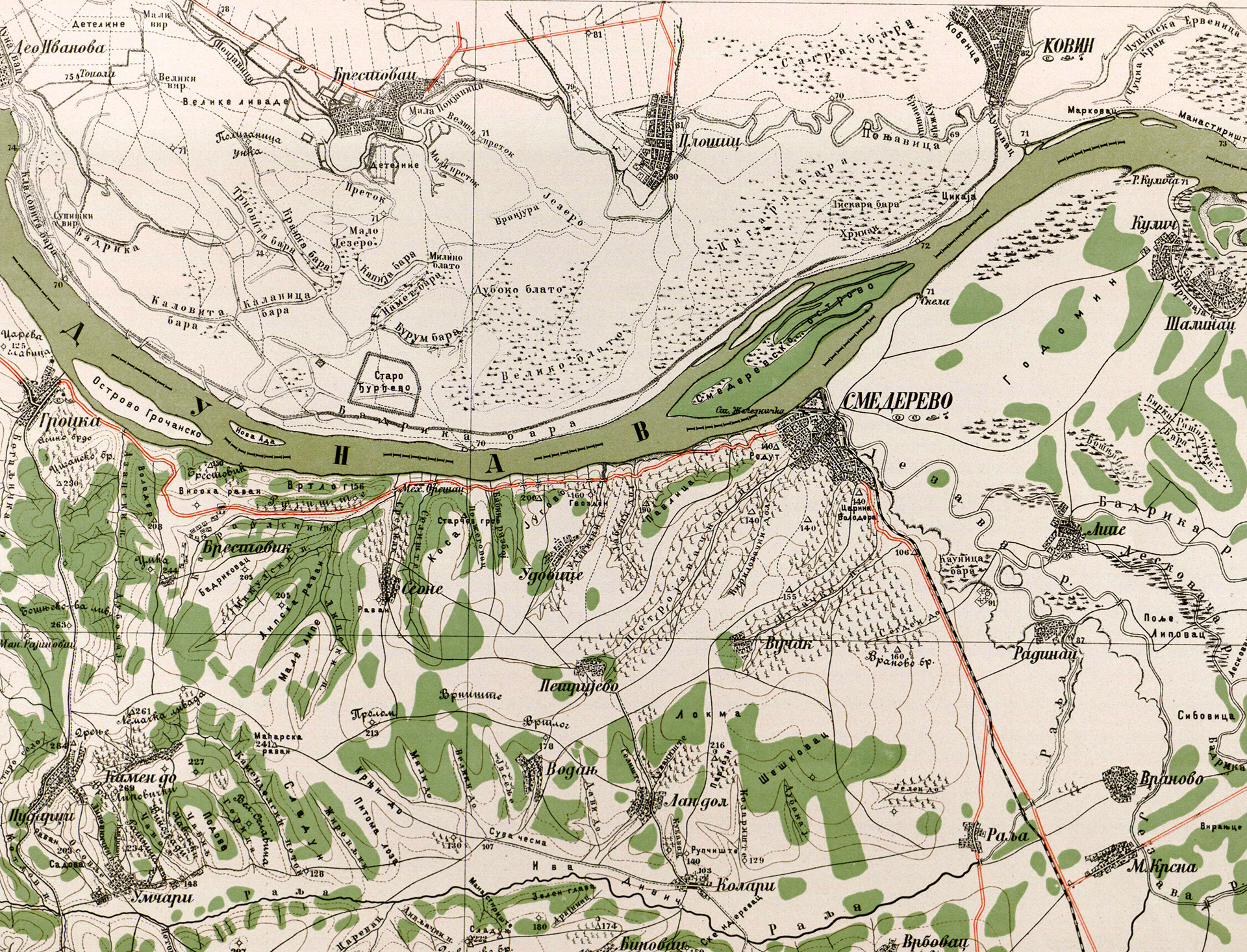 Са таквим јединицама, у којима су били Чачани, Пожаревљани и Неготинци, организована је одбрана смедеревског одсека са укупном ширином фронта од око 20 км. Одсек се делио на два пододсека, леви од потока Средњак до ушћа реке Језаве и десни од Језаве до ушћа Велике Мораве. Постојале су и три линије одбране. Прва линија била је уз обалу Дунава, где су ровови пратили ток реке, друга се пружала преко потеса Тарабе и Молеровог шанца до Провалије, док су трећу линију одбране чинили ровови на падинама Павлице и артиљеријски положај на Југову.