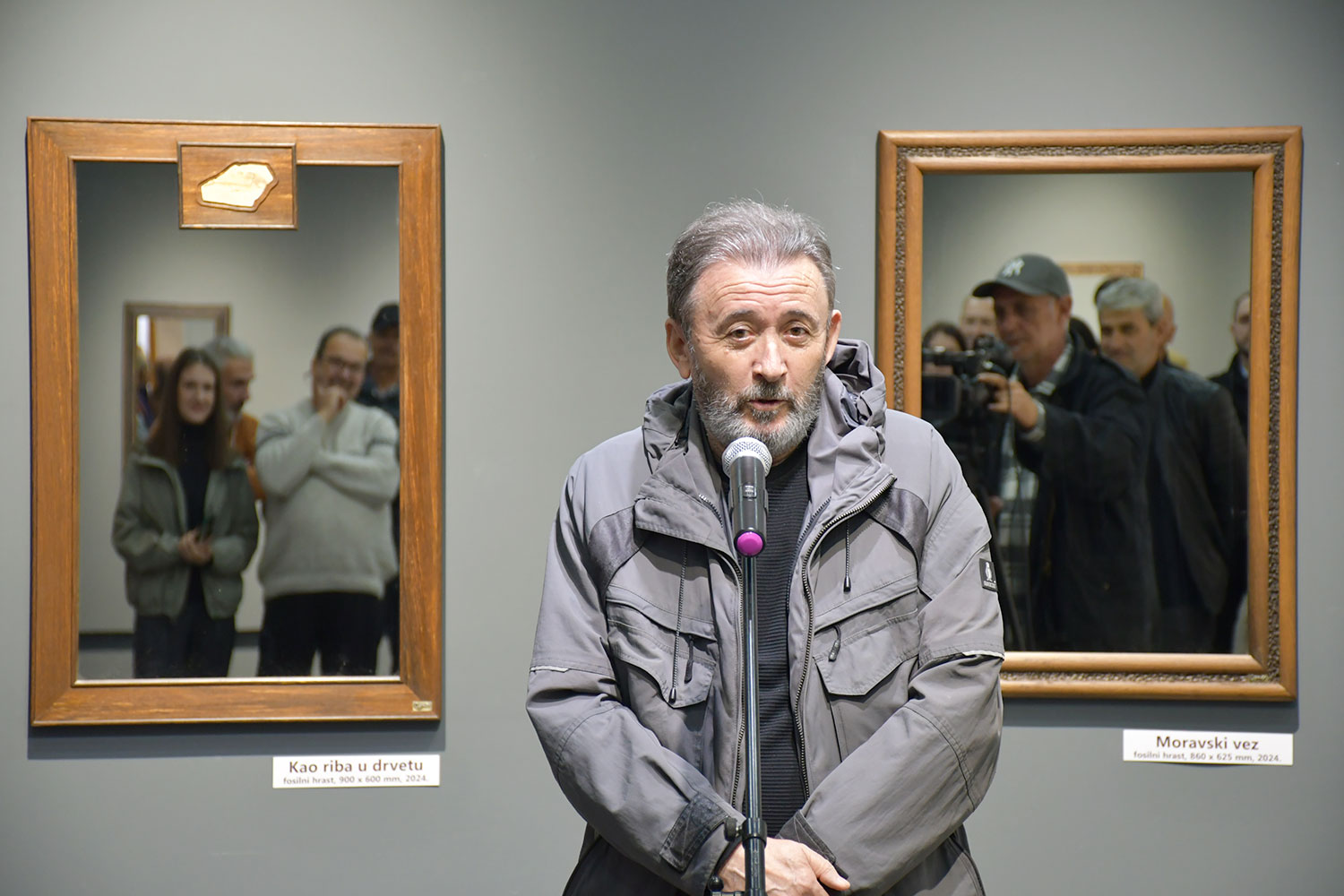 Поштујући наталожено време, лепоту и постојаност наумили смо да на неки начин помогнемо нашем пријатељу, фосилном храсту, да изађе на видело. Можебити да је хиљадугодишњи боравак у води, у муљевитој средини, својеврсна осуда на трајање, на нешто ште је непознато и што се, понекад бојажљиво, зове вечност. Наше упознавање са фосилним храстом траје годинама. Трудили смо се да га удобно сместимо у одговарајућу форму и определили се за огледало, уверени да ће управо тај оквир, тај рам, најбоље учврстити веру у живу слику с ове стране стакла. Да се разумемо: фосилни храст су обликовали време и вода, минерали и метали, дарујући му боју и чврстину на којој могу да му позавиде многи из света флоре.